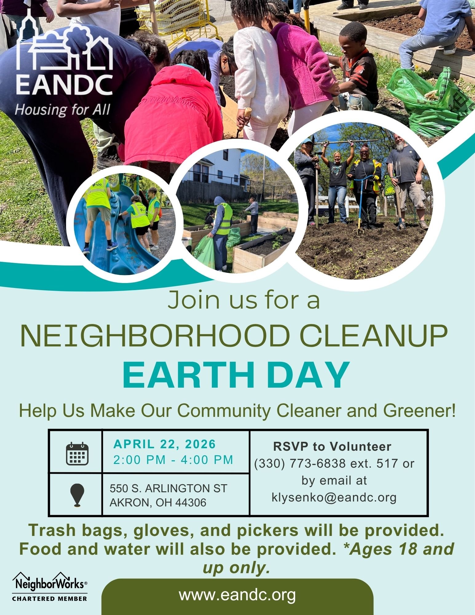 Every year at EANDC we work with members of the community to take care of our planet on Earth Day. Last year, we cleaned up our community gardens in the Akron area to prepare them for planting in May. This year we will be doing an East Akron neighborhood clean up in select locations. We will be meeting at our offices located on 550 S. Arlington Street in Akron. We will be picking up trash along S. Arlington Street into 5th Avenue, Chiteenden Street, then Mckinley Avenue. We will finish cleaning at our Chittenden and Mckinley Community Garden.